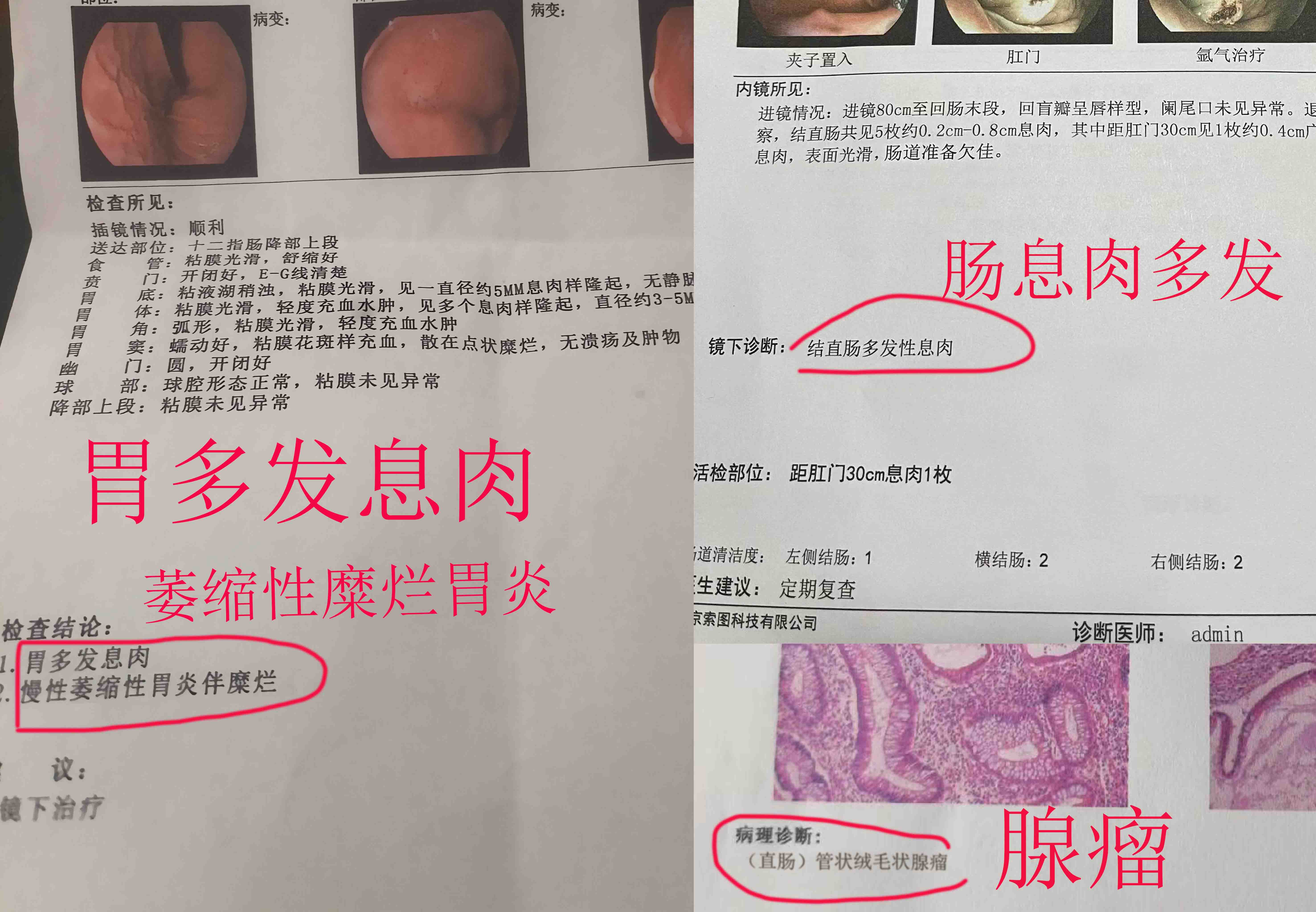上面是第一次做肠镜,那是2016年某天因工作需要吃完饭后,腹痛了三天一直没好,还越来越重,同事见状把我送去医院做检查,一直以为自己的胃有问题。以前还检查出有幽门螺旋杆菌,吃了很多抗生素。这次趁做大肠镜检查,干脆胃镜和肠镜一起做。做出来一看是肠息肉多发伴有肠腺瘤和胃息肉多发息肉,还合并慢性糜烂性萎缩性肠胃炎。把我吓了一跳,没想到这么多。医生直接给做了手术钳除了。并叮嘱我要注意饮食。医生说是遗传性的,我父亲也有肠息肉。